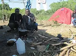 Since the demolition of the large Jungle camp in 2016 there has been an administrative policy of "no fixation points" for migrants to settle in, aiming to stop another large camp from forming.[22] Police, including the Compagnies Républicaines de Sécurité (CRS), and clearance teams regularly evict migrants from their makeshift camps with new encampments later forming in another or the same location.[23][24][25][26] The encampments are dangerous due to exposure and poor living conditions resulting in health difficulties.[27][28][29][30] A hostile environment is created for the migrants,[31] with migrants and NGOs reporting violence from the police directed at migrants[26][32][33][34] and the local administration occasionally banning the distribution of food and water to migrants.[35][36]