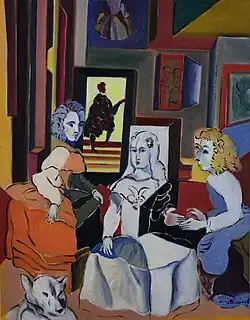 A prominent example of this tendency is the figure of the Virgin of Legarda, the patroness of Quito, which frequently appears in his works, inspired by the statue atop the El Panecillo hill. Additionally, Betancourt has reinterpreted iconic works of world art in his own style. Notable among these is the series Nymphs, Maids of Honor, and the Painter's Gaze, where the artist uses Diego Velázquez's Las Meninas as a foundation for a series of compositional variations on paper and canvas.[19] The original painting serves as a central motif from which Betancourt unfolds a personal interpretation through his artistic language.