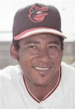 On May 29, 1970, Cuellar struck out 10 batters, including four in the same inning, as he threw a four-hit shutout against the Angels.[49][50] Twice in the first half of the season, he allowed only two hits in a game, on May 24 and June 11 (both Oriole wins).[51] He threw a four-hit shutout against the Tigers on July 3, then pitched all 10 innings of a 6–2 victory over the Yankees four days later.[51] Cuellar made the All-Star team for the second time, picked by Weaver, who was managing the team.[52] Through June, his ERA was 4.34 (though his record was 8–5), but Cuellar only lost three times for the rest of the season while winning 16 more games and posting a 2.78 ERA.[2] On August 11, he threw a four-hit shutout against the Angels for the second time that season.[53] On August 27, Cuellar became the second pitcher in the AL (after teammate McNally) to win 20 games, allowing 10 hits but earning the win in a 6–4 victory over the Athletics.[54][55] He threw his fourth shutout of the season on September 9, necessary for Baltimore's 1–0 victory over the Yankees.[56] Cuellar's win–loss record was 24–8 in 1970; he recorded a 3.48 ERA and 190 strikeouts.[11] Cuellar's 24 wins tied with McNally and Jim Perry for the major league lead.[57] He led the AL in games started (40, tied with four others), and complete games (21), also ranking among the AL leaders in strikeouts (fifth), shutouts (four, tied with two others for third), and innings pitched (297+2⁄3, third, behind Palmer and Sam McDowell's 305).[58] However, Cuellar finished in fourth place in the voting for the American League Cy Young Award. "He should have won the Cy that year, but not doing so never affected his performance," teammate Palmer opined.[45] In the AL MVP voting, Cuellar finished 11th.[11] Cuellar, Palmer, and McNally combined for 68 wins, the most for a starting trio since three Detroit Tigers did so in 1944.[31]