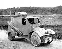 Based on his experiences in the Manchurian war, Nakashidze proposed a draft for an armored car design to General Nikolai Linevich of the 1st Manchurian Army. Shortly before the conclusion of the Russo-Japanese War he presented his idea to the Ministry of War of the Russian Empire where Nakashidze's initiative was supported by General Linevich. The idea was approved, however, there was no construction plants that could produce armored vehicles in Russia, which is why design and order were handed over to French company Charron. Prince Nakashidze was the co-owner of Charron, a position he probably used to lobby the company's interests in Russia. Charron had already constructed an armored car, the Charron, Girardot et Voigt in 1902. The same vehicle was the basis for a more combat effective and uparmoured variant designed by Nakashidze in 1905, which was finished the same year, referred to as "Charron-Nakashidze".[1] The original construction order of 36 cars was initially reduced to one experimental prototype for field testing in Russia. The overall impressions were positive. The vehicle had a high ground clearance, armoured wheel disks, a portable bridging device to negotiate obstacles such as trenches, revolving turret with one machine gun mounted and another in reserve, and was clad in 4–5 mm thick armour. All trials had a generally favourable outcome and the commissions concluded that the vehicle had great value for reconnaissance behind enemy lines, as well as communication, and anti-cavalry operations. A total of eight Charron-Nakashidze's were constructed for the Russian army.[2] The French kept two vehicles.