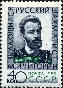 Mikhail Ivanovich Chigorin (also Tchigorin; Russian: Михаи́л Ива́нович Чиго́рин; 12 November [O.S. 31 October] 1850 – 25 January [O.S. 12 January] 1908) was a Russian chess player. He played two World Championship matches against Wilhelm Steinitz, losing both times. The last great player of the Romantic chess style, he also served as a major source of inspiration for the "Soviet chess school", which dominated the chess world in the middle and latter parts of the 20th century.