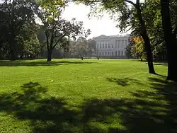 During the imperial period the garden was a private space and closed to citizens.[4] Grand Duke Michael's wife, Grand Duchess Elena Pavlovna, took chief responsibility for the palace and garden, and the spaces were used to host events, horseback riding and balls. During this period the nickname "Elena Pavlovna's Garden" became popular among the city's residents.[3] A 1839 description of one of the Grand Duchess's balls recorded that "During the ball, the garden and the palace were turned into a kind of exhibition of Saint Petersburg gardening. All the flowers from the Pavlovsk and Oranienbaum greenhouses were brought to the ball via the pier of the Mikhailovsky Garden on two hundred carts. Everything in the palace was blossoming and fragrant ... From the garden shone a fantastic illumination, with a wonderful view of the Field of Mars and the Neva".[3]