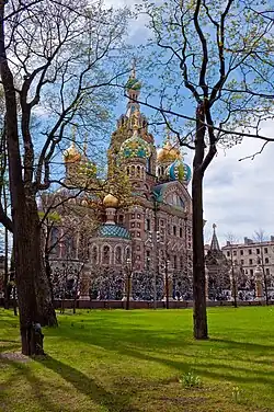 The Mikhailovsky Garden is in Dvortsovy Municipal Okrug, part of the Tsentralny District of the city. It covers 9.4 hectares and lies to the north of the Mikhailovsky Palace, now the main building of the Russian Museum, and its extension, the Benois Wing.[1][2] The building of the Russian Museum of Ethnography completes the southern boundary of the garden. To the east the garden is bordered by Sadovaya Street, and to the west by the Griboyedov Canal and embankment, and the Church of the Saviour on Blood. The Moyka River flows across the northern end of the garden, and separates it from the Field of Mars.[2]