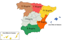 The military regions of the Spanish Armed Forces were a administrative subdivision that existed in Spain from the 18th century to the end of the 20th century. They constituted a territorial subdivision in terms of the allocation of human and material resources for defence purposes, and responded to a territorial defence model (see es:Neutralidad armada, Armed Neutrality).