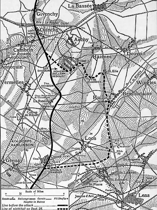 At a meeting with his corps commanders (13 August) Haig asked Gough to draw up plans to take the Hohenzollern Redoubt, while Rawlinson was to take Loos and possibly Hill 70.[46] Gough (22 August) proposed that 9th Scottish Division should "rush" the German positions on his left (Hohenzollern Redoubt, Fosse 8) just before dawn (4 am) after a barrage and gas attack, while the following night 7th Division would push through the Quarries to Citie St Elie.[47] Haig recorded (1 September 1915) how "active and energetic" Gough and the artillery officer Noel Birch were, and insisted that Rawlinson (who proposed a limited stage-by-stage operation) also use gas for his initial attack.[48][49] Gough would later (The Fifth Army p. 101) call gas "a boomerang ally"[50] Gough later wrote that he had been dismayed at the lack of guns and ammunition. Neither Gough nor Rawlinson's corps had any divisions in reserve – in Gough's case only one brigade from each of his three divisions.[51]