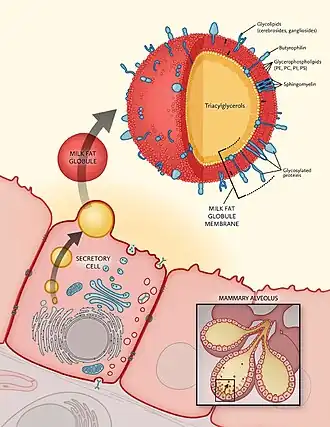 - ^ a b Heid HW, Keenan TW (March 2005). "Intracellular origin and secretion of milk fat globules". European Journal of Cell Biology. 84 (2–3): 245–258. doi:10.1016/j.ejcb.2004.12.002. PMID 15819405.