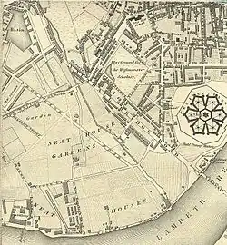 Millbank Distillery was a London gin distillery owned and operated by Seager Evans and Co. It was located on Grosvenor Road on the North bank of the River Thames in Pimlico. The company's best known product, Seagers Gin, was produced here up until the early 20th century. Millbank Distillery is often confused with Thames Bank Distillery a slightly older distillery, founded in 1797 and located further west along the river. Thames Bank Distillery was owned by Octavius Smith & Company - it was located on Grosvenor Road - its rear boundary was Lupus Street and on either side of it were Glasgow Terrace and Turpentine Lane.