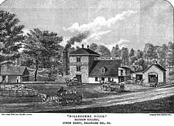 A stream which empties into the Millbourne dam supplying the water to Millbourne Mills, in 1800, was an oil-mill, which continued until 1848. The old grist-mill stood above the present mill. In 1820, it was used for grinding gypsum. As late as 1830, Augustus C. Jones was operating the old mill in grinding logwood, spices, etc. It was later discontinued. The new mill, built in 1814, was placed under the charge of John Sellers, Jr., and was fitted with all the improved machinery of that time.[1]