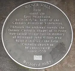 In 1779, John Milner, later Bishop Milner, became the resident priest in Winchester. In 1784, he paid for an extension to be built onto the chapel. Later, he rebuilt the chapel in the Gothic revival style. The architect was his friend John Carter and the chapel was consecrated on 5 December 1792. The building still exists, it is called Milner Hall, was restored in 1986 and acts as the parish hall next to the church.[4]