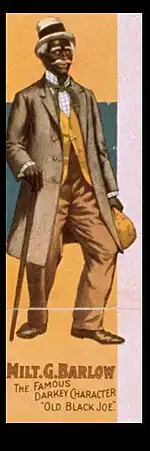One of Barlow's earliest performances was in 1867 when he teamed up with James and William Arthur, a song-and-dance duo who called themselves the Barlow Brothers.[5] Beginning in 1871 Barlow would play in such minstrel shows as the Jackson Emorsonians, Harry Robinson's Minstrels, Benjamin's New Orleans Minstrels, Haverly's Minstrels and Sweatman and Frasier's Minstrels. In 1877 he formed with George Wilson, George H. Primrose, and John T. West, the very successful Barlow, Wilson, Primrose and West Minstrels. In later years he would form shows with George Wilson and later yet with Wilson and Carl Rankin.[1] Barlow also toured in a number of plays, usually playing African American slaves or former slaves. His most notably performances were in Uncle Tom's Cabin where he played the title role and in productions in which he played Old Black Joe, a character he had created over the years. Milt G. Barlow was, for better or worse, considered one of the best "burnt-cork" actors of his day. His finale performances were in 1903 playing the Minister to Dahomey, in A Texas Steer productions.[6]