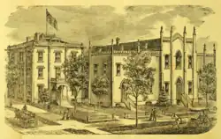 In 1863, the continued pressure of adverse times occasioned the withdrawal of the ladies in charge, and Prof. S. S. Sherman assumed the control of the college. The three years of his connection with the college were prosperous. Through the efforts of the Trustees, repairs and improvements were made in the buildings, the library increased, and philosophical, chemical and astronomical apparatus added. Beecher, however, took the ground that the change in the management of the college, was a departure from the original plan and intention of its founders, and a violation of agreement, and in 1866, on behalf of the Educational Association, she entered a protest against the continuance of this management, which occasioned the immediate and voluntary resignation of Prof. Sherman. In the Autumn of 1866, the school opened with Mortimer once more at the head, and with the various departments divided and officered as originally intended. In the following year, an addition was made in the rear of the main building, for use as a gymnasium, the expense defrayed by subscriptions amounting to US$3,000. For eight years, the college remained under Mortimer's supervision, with continued usefulness, and with a large number of graduates, until, in 1874, Mortimer resigned her position.[5]