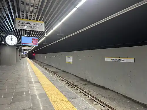 Mimar Sinan is an underground station on the M9 line of the Istanbul Metro.[1][2] It is located under Mimar Sinan Street in the Bağlar neighbourhood of Bağcılar. Due to slow construction progress, it could not be opened with the rest of the extension of M9 from Bahariye to Ataköy on 18 March 2024. The station was opened on 30 August 2024.