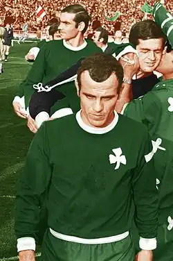 In his first three seasons, he won the same number of championships. He scored in the game that secured the last one on 4 June 1961 in a 3–3 draw against Panionios.[4] On 26 November 1963, Domazos scored four goals in the 5–2 away win against Proodeftiki and became the first player in the club's history to score four goals in an official match.[5] He became the captain of the team for almost 15 years.[6] He formed an attacking duo with his teammate and best friend, Antonis Antoniadis. In the Cup final in 1969, he scored a free kick against Olympiacos and after the 1–1, on a flip of a coin during extra time, he chose correctly and his team was awarded the title.[7] He led Panathinaikos, under Ferenc Puskás, to the Final of the European Cup at Wembley Stadium against Ajax on 2 June 1971 where they lost 2–0.[8] In December of the same year, he also participated in the two-legged final of the Intercontinental Cup against Nacional where they lost 3–2 on aggregate.[9] He was nominated for the Ballon d'Or in 1969 and 1971.[10] Another remarkable moment of his career was in 1977 when Panathinaikos won the Balkans Cup, even though he did not compete in the double final against Slavia Sofia.[11]