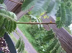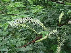 The fern-like branches have leaves that are Mimosa like, finely pinnate, growing to 5 cm (2.0 in) long. Each compound leaf contains 15–33 pairs of bright green leaflets 5–6 mm (0.20–0.24 in) long. The tree itself grows up to 8 m (26 ft) tall[3] and it can reach 4–5 m (13–16 ft) tall in less than 5 years. The white,[3] fragrant flowers occur in loosely cylindrical spikes 4–8 cm (1.6–3.1 in) long. In the Northern Hemisphere it blossoms and produces fruit from November to June or July.[4] In the Southern Hemisphere it blooms primarily from September to January. The fruit is brittle and averages 2.5–5 cm (0.98–1.97 in) long. Each pod contains 4–6 seeds that are oval, flat, light brown and 3–4 mm (0.12–0.16 in) in diameter. There are about 145 seeds/1 g (0.035 oz).[5] In the Southern Hemisphere, the fruit ripens from February to April.