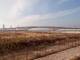 The Minato Bridge is a double-deck cantilever truss bridge in Osaka, Japan; upper deck is for Hanshin Expressway Route 16 Osakako Line, and lower deck is Route 5 Bayshore Line. It opened in 1974. It is the third-longest cantilever truss span in the world, behind the Quebec Bridge and the Forth Bridge.[2]