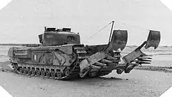 The British started work on plow designs in 1937, and a successful design was introduced for the Matilda Mk I tank though it was not used.[1]