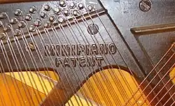 Although most pianos have three strings per note, the minipiano ‘Pianette’ model consists of monochords for the lowest 31 keys and bichords for the remaining 42 keys. A bichord is a single piano wire which is tightly wrapped around two metal pins but which is divided into two by a single nail. One of the pins is positioned slightly higher than the other, but the two pins are tuned separately to produce the same tone. The fact that these pins can be tuned at the front of instrument with a piano wrench make many forms of the minipiano unique. With only monochords and bichords, the 'Pianette' model could never have been expected to produce the richness of sound of a standard upright or grand piano. Still, the 'Pianette', after its release in 1934, was enormously popular; apparently people lined up outside of stores to view the sleek new models in London High Street stores, and a large number of the instruments were sold all around the world.[1]