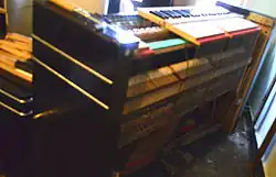 A minipiano differs from an upright piano in many ways. The primary factor that sets it apart from types of piano still manufactured today is the fact that the soundboard, the piano wires and the piano action mechanism which produces sound by striking the wires, are extended beneath the instrument rather than above it (as in an upright piano) or behind it (as in a grand piano). It is also well known for its 'braceless' removable back. Braces are wooden pieces designed to support the structure of the instrument,[7] but are entirely unnecessary when the back consists of a single removable wooden frame with a central support beam. Fabric is firmly stapled to the inside of this removable back to prevent dust getting through. What makes the minipiano exceptional is the way the tuning pins extend from behind the metal soundboard at the back into which the tuning pins are inserted through to the front, allowing the instrument to be tuned without actually having to remove the braceless back. Unfortunately these pins are no longer made making them difficult to replace.