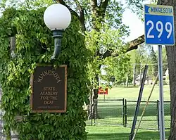 The schools are located about a mile apart in Faribault, on bluffs above the Cannon River. Two special state highways connect the campuses to Minnesota State Highway 60 and downtown Faribault: 299 goes north to the Academy for the Deaf; 298 goes south to the Academy for the Blind.