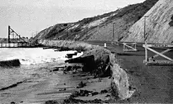 Three months after her wreck, the Minnie A. Caine created new problems for the city of Santa Monica and the California Highway Commission. A sandbank had quickly formed, connecting the grounded vessel to the shore and disturbing the intricate flow of currents inside the Santa Monica Bay.[82][97][98] As a result, ocean waves started battering and cutting into a 700-foot (210 m) section of California State Route 1.[97] By December 1939, 4,000 cubic yards (3,100 m3) of berm had washed off, causing erosion of the roadway.[99]