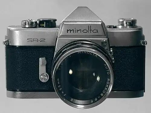 The Minolta SR-2 was presented in 1958 as the first 35mm SLR camera from Chiyoda Kogaku. Popular cameras of this type at that time were mainly from Europe but a few from Japan, including the Asahi Pentax, the Miranda T and the Topcon R. The miniature SLR camera concept was conceived in the 1930s at Ihagee in Dresden, resulting in the 1936 Kine Exakta. Influential cameras designs like that of the 1939 KW Praktiflex, the 1949 ZI Contax S, and 1952 the KW Praktina marked the steady progress toward a perfected SLR. Several features of the latter seem to have influenced the design of the SR-2 although dissimilar in many respects. The obvious similarities are the stepped top plate, the carrying strap lugs, the self-timer lever and some general body features.[1][2]