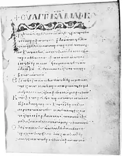 The text is divided according to chapters (known as κεφαλαια / kephalaia), whose numbers are given at the margin, and the titles (known as τιτλοι / titloi) written at the top of the pages. There is also a division according to the Ammonian Sections (in Mark 234, the last section in 16:9), with references to the Eusebian Canons added by later hand (these were an early system of dividing the four Gospels into different sections).[4] It contains the tables of the κεφαλαια / tables of contents before each Gospel (however these are inaccurate), and subscriptions at the end of each Gospel. It also contains the Synaxarion (an index to the weekly lessons to be read out in a church).[4] The manuscript was extensively altered by a later hand.[5]