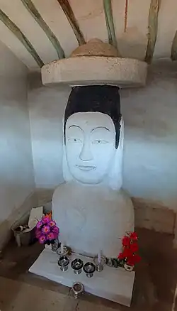 The small brick building, 3.1m in height, was built to house a statue of Maitreya, who was believed to protect the village where it stands. Only the upper half of the granite statue is exposed, with the lower half below ground. The upper body alone is about 2.44m in height, the chest is about 1.07m wide, and the head measures about 1.14 cm in height.[2] The statue is believed to represent a Maitreya combined with folk beliefs since the mid-Joseon Dynasty due to its sculpting technique. The statue is made from a single granite rock, and features an oval pedestal.