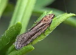 The wingspan is 6–7.5 mm for males and 5.5–7.5 mm for females.[2] Terminal joint of palpi as long as second. Forewings pale ochreous, more or less irrorated with dark fuscous, more strongly on margins, and sometimes with whitish; usually a broad cloudy blackish-fuscous streak along fold to before middle, connected with another in disc from 1/3 to apex; above these a pale subcostal streak; stigmata blackish, usually concealed in the dark streaks. Hindwings very pale grey. Larva dull green; dots black; head black; plate of 2 black, with central white line.[3][4][5][6]