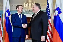 At the June 2018 early election, Cerar was re-elected deputy and his party obtained 9.7% of the vote thus losing its leading position among centrist voters.[14] Despite considerably lower results compared to the previous election, SMC got ten deputies in a 90-seat Parliament and preserved an important role in the Slovenian political arena (sharing the third position in terms of the number of deputies). This was also one of the reasons why the party was crucial in forming the new coalition government, where it took over four ministries. In the centre-left Government, formed by Marjan Šarec in September 2018, Cerar was appointed deputy Prime Minister and Minister of Foreign Affairs; he discharged these duties until the Government resigned in March 2020.[15]