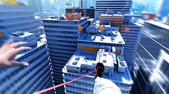 Mirror's Edge is an action-adventure platform game where the player must control the protagonist, Faith Connors, from a first-person perspective and navigate a city.[2] To progress through the game and its storyline, the player needs to complete a series of levels that involve performing a linear sequence of acrobatic maneuvers.[3] These include jumping between rooftops, running across walls, climbing pipes, walking along ledges, sliding down zip lines, and getting past opponents controlled by the game's artificial intelligence.[4] The visibility of Faith's arms and legs is used to convey her movement and interactions with the environment.[5] Her momentum is an important aspect of the gameplay,[6] as preserving it through multiple obstacles allows the player to run faster, jump farther and climb higher.[4] To help players chain moves seamlessly, the game employs a navigation system, called Runner Vision, which turns certain objects to a bold red color as Faith approaches them, allowing the player to instantly recognize paths and escape routes.[5]