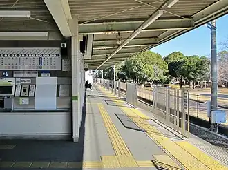 The station has a one side platform, serving a single bi-directional track. The station building has automated ticket machines, and automated turnstiles which accept the NicePass smart card, as well as ET Card, a magnetic card ticketing system. The station is unattended.