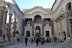The architectural surround has often been compared to a peristyle at Diocletian's Palace in Split, Croatia, where the emperor retired after abdicating his powers. This opens from the imperial residence to a courtyard that has been regarded as a setting for ceremonial audiences such as the one shown on the dish, but this interpretation is uncertain.[5]