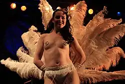 Missy Malone performing a fan dance in Calafell, Catalonia, Spain in 2010