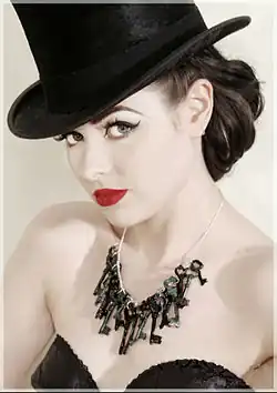 From 2003 Malone became a regular performer in the British Burlesque scene, performing across the country in shows like Candybox burlesque in Birmingham[10] and Torture Garden London.[11] In August 2006 Malone performed at the Italian rockabilly festival 'Summer Jamboree' with her then dance partner Foxy (Rachel) Rouge for over 2000 people.[12] Malone took up full-time work as a burlesque performer from December 2007 when she toured with The Damned on their 'twisted Cabaret' UK/Ireland tour.[13]