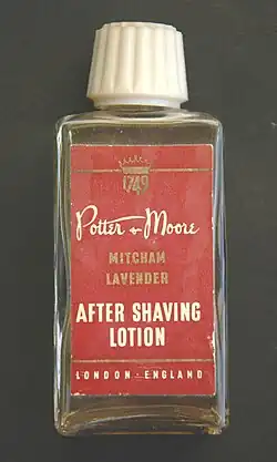 Many lavender fields were in Mitcham, and peppermint and lavender oils were also distilled. In 1749 two local physic gardeners, John Potter and William Moore, founded a company to make and market toiletries made from locally grown herbs and flowers.[6] Lavender features on Merton Council's coat of arms and the badge of the local football team, Tooting & Mitcham United F.C., as well as in the name of a local council ward, Lavender Field.