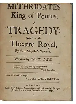 Mithridates, King of Pontus is a 1678 tragedy by the English writer Nathaniel Lee. It was first performed at the Theatre Royal, Drury Lane in London by the King's Company. John Dryden wrote the play's epilogue.