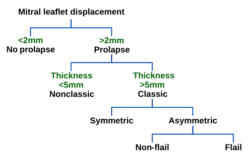 Prolapsed mitral valves are classified into several subtypes, based on leaflet thickness, type of connection to the mitral annulus, and concavity. Subtypes can be described as classic, nonclassic, symmetric, asymmetric, flail, or non-flail.[29]