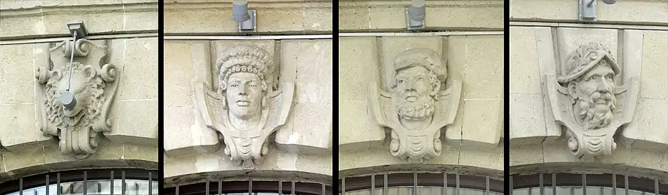 The rectangular shop spaces on the first floor are made of unsawn stone (rustication) masonry. The entrance to the yard is a metal grid and is along the axis of the central part. The architect managed to emphasize the importance of the central part by legally distributing the architectural composition of the facade on the first and second elements and strengthened it with a low attic. The pilaster side of the façade repeats the compositional method of the central fragment, where the architecturally designed, bracketed balconies are located in the appropriate convenient positions on the façade. The architect used a compact nomenclature of details and form elements to solve the façade composition. [2]
