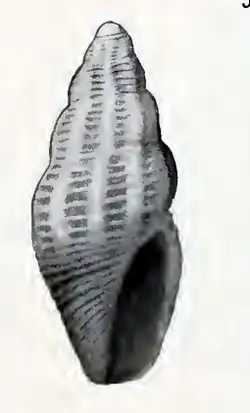 (Original description) The shell is small and white. The protoconch consists of at least one whorl, which appears to be smooth. (In our specimens this is somewhat worn.) The five post-nuclear whorls are well rounded and separated by a well impressed suture. They are marked by strong, low, rounded, retractive axial ribs, which are not quite as broad as the spaces that separate them. Of these ribs, about 12 occur upon all the whorls. These ribs disappear shortly after passing over the periphery of the base. In addition to the axial ribs, the surface of the shell is marked by numerous, fine lines of growth. The spiral sculpture consists of well-developed cords, which are about half as wide as the spaces that separate them. Of these cords, 4 occur between the sutures on the first whorl, 5 upon the second, 6 upon the third and 7 upon the penultimate whorl. The base of the shell is marked by about 15 spiral cords, which equal those on the spire in strength and spacing. The aperture is moderately large. The posterior angle is obtuse, scarcely channeled. The outer lip is thin, rendered slightly sinuous by the spiral cords on the outside. The columella and parietal wall are covered with a thin callus. [2]