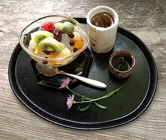 Mitsumame (みつまめ) is a Japanese dessert. It is made of small cubes of agar jelly, a white translucent jelly made from red algae or seaweed. The agar is dissolved with water (or fruit juice such as apple juice) to make the jelly. It is served in a bowl with boiled red field peas[1] (or sometimes azuki beans[2]), often gyūhi, Shiratama dango and a variety of fruits such as peach slices, mikan, pieces of pineapples, and cherries. The mitsumame usually comes with a small pot of sweet black syrup, kuromitsu, which one pours onto the jelly before eating. Mitsumame is usually eaten with a spoon and fork.