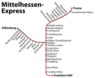 The Mittelhessen-Express runs on the Treysa – Gießen – Frankfurt () and Dillenburg – Giessen – Frankfurt () routes, although many services on the RB 41 have not run over the entire route since 13 December 2015. The RegionalBahn services on the Gießen – Fredberg – Hanau route (RB 49) are also branded as Mittelhessen-Express. When Hessische Landesbahn took over operations in December 2023, the existing lines were supplemented with a new Frankfurt – Friedberg – Gießen (– Kirchhain) line (RB 37) as an hourly addition to the RB40/RB41 that stops at all stations between Friedberg and Gießen. In a second operating stage from December 2026, the RB37 is planned to run hourly between Frankfurt and Gießen, while all trains running as coupled portions (RB 40 and RB 41) will run with limited stops between Frankfurt and Gießen.[1]