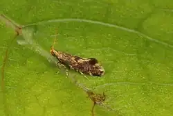M. fusca is small and dark brown in colour with patches of ochreous-yellow on its forewings.[1] The maximum length of the forewing is 3.5 mm.[1] The genitalia of M. fusca is quite distinct from similar species such as M. hudsoni and M. fallax.[1]