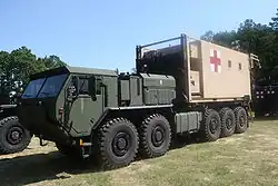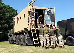 A Mobile Trauma Bay is a containerized ambulance bay mounted on an Oshkosh Logistic Vehicle System Replacement (LVSR).[1][2] It holds state-of-the-art medical equipment and carries a Shock Trauma Platoon, generally consisting of one doctor, a nurse and three corpsmen, providing advanced resuscitative care to critically injured service members within the first hour after a traumatic injury (the "golden hour"). It takes emergency medical care far forward, saving more lives.[3][4] Over 98% of the wounded Marines who make it into the MTB, make it out alive.[5]