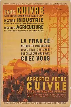 Posters were put up in the towns and cities of France encouraging the population to participate in the campaign by contributing their copper and lead everyday objects such as door knobs, cauldrons, lamps, candlesticks and bicycle frames to a central 'metal tax'.[5] To avoid protests and incidents, the posters only mentioned the agricultural and not the military uses for the metals.[3] The French state paid groups and individuals 6 francs per kilo of lead, 30 francs per kilo of brass, copper, copper alloys, bronze and nickel silver and 75 francs per kilo of tin.