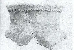 - Moccasin Bluff scalloped (10 vessels), characterized by scalloped treatment of the rim edge.[3] Pottery of this type has been recovered from the Dumaw Creek and Schwerdt sites, as well as other west Michigan sites, where it is suggested it may have been made by the Potawatomi.[14][7] Time period: Late prehistoric to Protohistoric or early Historic. Prehistoric Cultural affiliation: Late Woodland. Protohistoric/Historic Cultural affiliation: unknown, possibly Potawatomi.