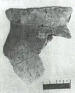 Further excavations were conducted in 2002 to further clarify questions about the subsistence patterns and site function.[21][22] Further examples of Moccasin Bluff Ware were recovered; Moccasin Bluff Plain Modified Lip, Moccasin Bluff Impressed Exterior Lip, Moccasin Bluff Scalloped, Moccasin Bluff Cordmarked, and Moccasin Bluff Plain.[22] In addition, there were vessels recovered from the Middle Woodland and also a partially reconstructed vessel from the Early Woodland, a poorly represented time period in the 1948 excavations.[22]