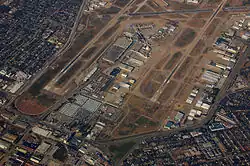 Dallas Love Field, Mockingbird Lane is the road furthest foreground, while Cedar Springs Road is the road connecting to the terminal