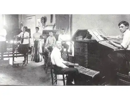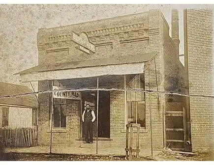 The Modern News Building is a historic commercial building at 216 North Main Street in downtown Harrisburg, Arkansas. It is a single-story rectangular brick building, with a flat roof and simple styling. A tall front steps down toward the rear of the building, with the side walls capped in ceramic tile. The original building measured only 40 feet deep, in 1910 an addition of 15 feet was added, then as additional 20 feet was added in 1952. The facade is three bays wide, with a center entry flanked by recessed windows. The brick facade was changed from the original design in 1953 as an attempt to modernize the building. Included in the gallery of this article, are a couple photos showing the original facade. A canvas awning extends across the facade. The building was built in 1896 and is significant as the home of The Modern News, which has been Harrisburg's newspaper until 2018. An account in an 1896 Modern Newspaper, revealed the correct date of construction to be 1896, rather than the more commonly believed date of 1888. Prior to 1896, it is believed the newspaper was run from the courthouse. L.D. Freeman purchased the newspaper in Harrisburg and changed its name in 1888. Before Freeman bought the business, the newspaper was called The Arkansas Tribune, and it is unclear of what date that started, though it would have been around 1873. It is local folklore that the original printing press that was being replaced was too large and heavy to remove from the structure, so someone went under the building, dug a hole deep enough for the press to fit, cut the floor out from underneath it, and buried it, sealing it with a new concrete floor throughout. It is a great pride the people of Harrisburg, Arkansas have that we possess most all of the original prints of the Modern News Paper in their original binding. Poinsett County Historical Society has worked with the Poinsett County Library to document these fragile historical documents by use of a scanner to help digitize them, so they are more accessible to the public. The scans can be seen and studied at the local library just around the corner from the newspaper building. In addition to the collection of Modern Newspapers, several dozen original copies of The Arkansas Tribune from the 1870s are also still in existence. The building was sold in 2019 by an heir of the founders. The building is now used as an event venue operating under the same name. The space is used to host parties, weddings, gatherings, etc. This building remains a local landmark, despite the newspaper closing its doors.[2]