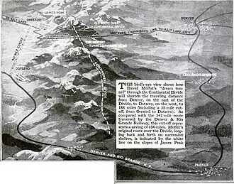 Moffat was unable to raise sufficient funds to build the tunnel before he died in 1911,[10] but the forces behind the tunnel continued, and in 1914 a Denver bond issue was approved, financing two thirds of the construction cost of the tunnel. The issue was defeated in a court decision which ruled that Denver did not have the constitutional right to enter into a joint venture to construct the tunnel with a private corporation.[11]