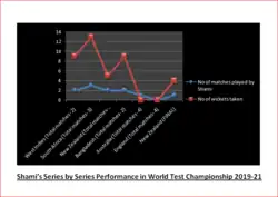 During the 2021–23 ICC World Test Championship, in the 2021 India-England series, on 16 August 2021, in India's second innings, Shami made his highest score and second half-century in Test cricket, with an unbeaten score of 56* in a partnership with Jasprit Bumrah, which helped team India to script a historical win against England.[58][59] Playing 3 matches in the 5-match series, Shami finished as the fifth highest wicket-taker of the series with 11 wickets[60] with the best figures of 4/95[61] coming during the first innings of the third match of the series.